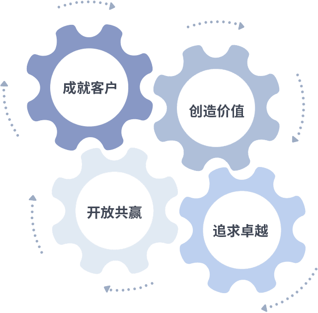 成就客户是一切决策的出发点,,创造价值是衡量所有工作的标准,,追求卓越是我们做事做人的态度,,,,开放共赢是我们的格局也是最终的结果。。价值观的齿轮环环相扣,,,,推动着组织里的每个人不断向前。。