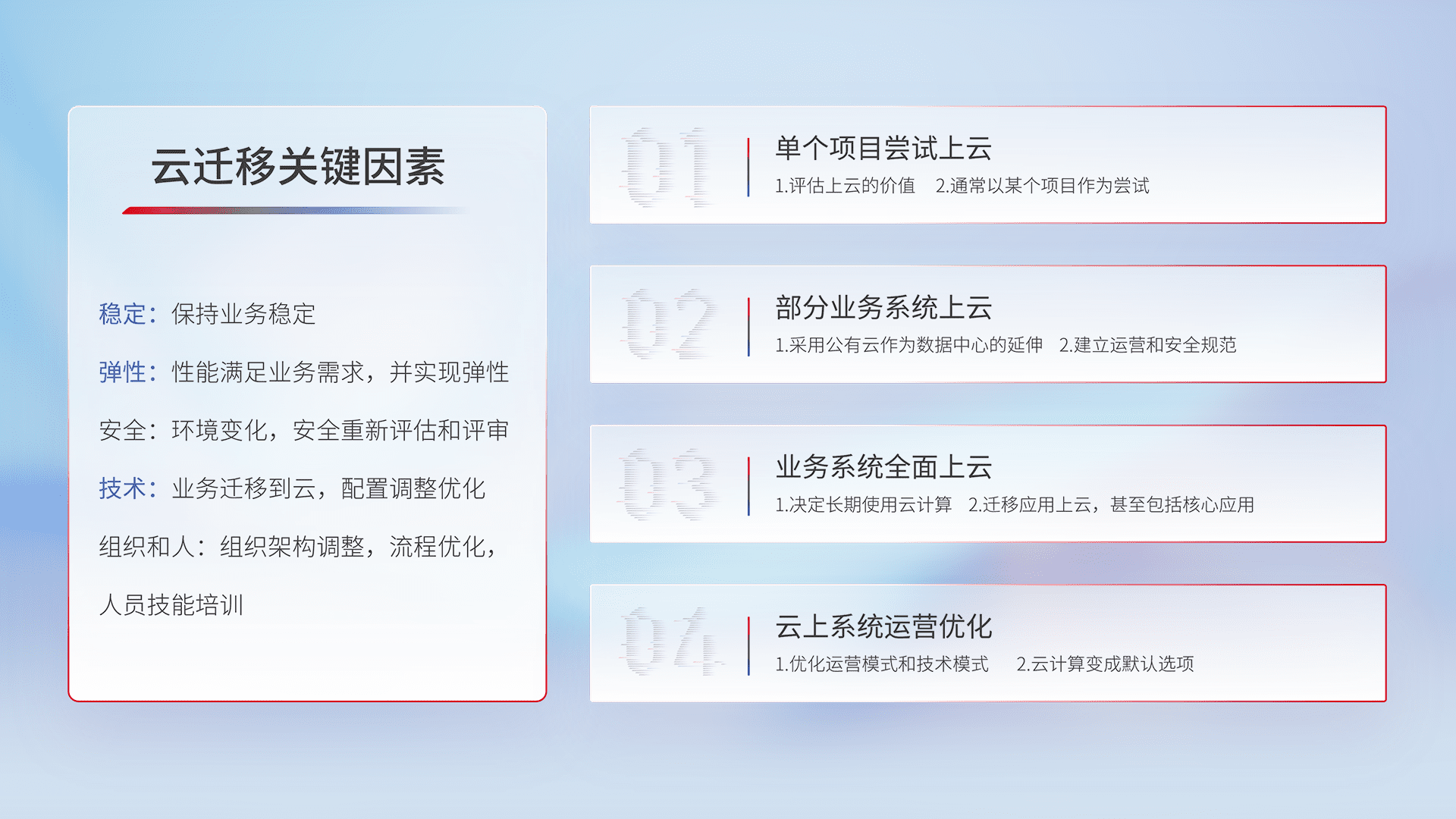 结合实际业务,,,从规划设计、、、、云平台选型、、、云原生改造、、数据迁移、、集成交付,,迁移全过程为客户识别最佳上云路径,,,做好风险识别管理,,,设计网络架构、、身份权限、、、安全审计合规、、、、操作审计、、日志审计、、、、监控告警策略、、多站点容灾设计等,,,对云上基础设施进行整体规划,,提升IT治理水平,,,以满足弹性、、、高可用、、、、高性能的需求。。。。