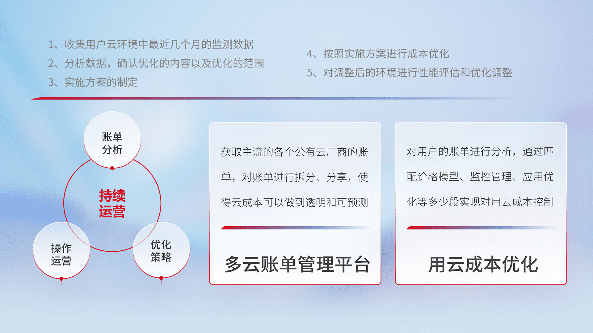 通过多云纳管,,以统一的资源数据模型把客户的云资源进行抽象和封装,,,,进而实现对多云资源的统一操作,,,,保障云资源管理的可靠性、、、、稳定性与可用性。。。量身定制化运维内容,,配置、、、、开发运维、、、、补丁管理、、、、备份、、监控、、认证和访问管理、、、、审计和日常巡检等,,,,保障在用云过程中的可靠度,,,,稳定度以及高可用率。。。。